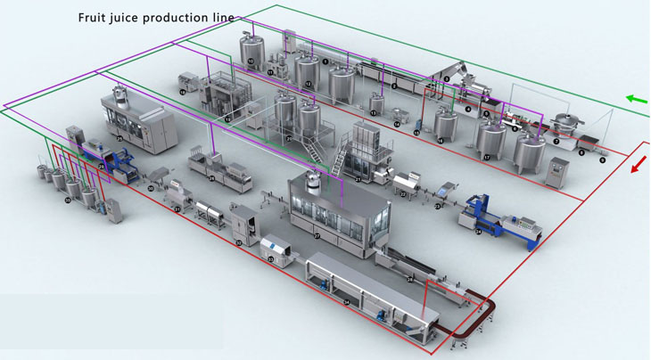 Các quy trình bao gồm lựa chọn và phân loại nguyên liệu, rửa, chần hơi nước, nghiền, xé, ép, lọc, đồng hóa, bài khí, tiết trùng UHT, chiết rót và đóng nắp, xử lý nhiệt và làm mát, dán nhãn, đóng thùng và bảo quản…