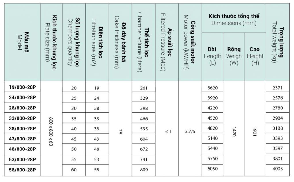 THÔNG SỐ KỸ THUẬT MÁY ÉP LỌC THỰC PHẨM 800X800 MM